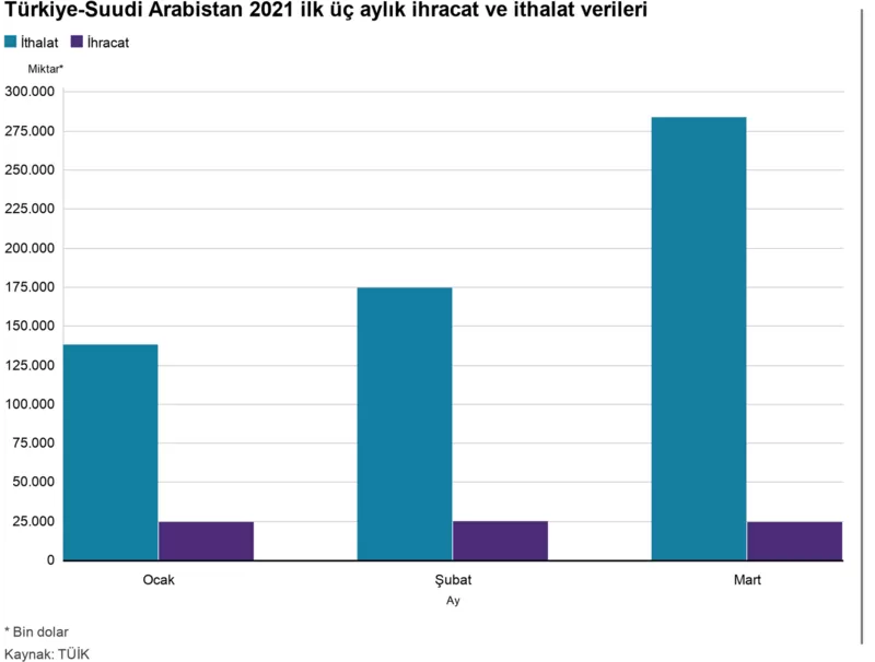 Suudi Arabistan'dan yapılan ithalat ise Ocak ayında 361.306.000 dolar; Şubat ayında 332.639.000 dolar ve Mart ayında 449.003.000 dolar oldu.