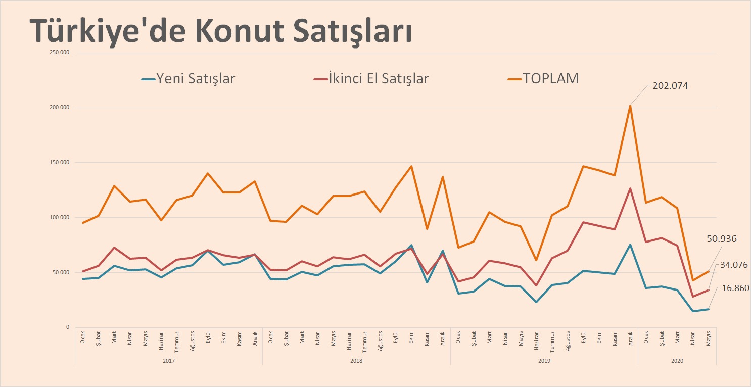 Türkiye genelinde ikinci el konut satışları 2020 Mayıs ayında bir önceki yılın aynı ayına göre yüzde 37,7 azalış göstererek 34 bin 76 oldu. İkinci el konut satışlarında İstanbul 5 bin 94 konut satışı ve yüzde 14,9 pay ile ilk sıraya yerleşti. İstanbul'daki toplam konut satışları içinde ikinci el satışların payı yüzde 66,7 oldu. Ankara 3 bin 728 konut satışı ile ikinci sırada yer aldı. Ankara'yı 2 bin 100 konut satışı ile İzmir izledi.