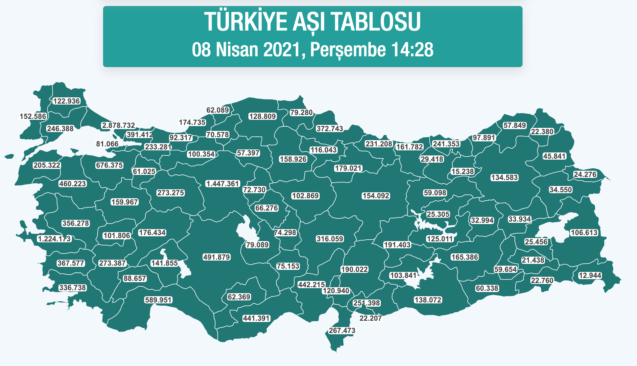 Covid-19 Aşısı Bilgilendirme Platformu'nda yer alan bilgiye göre Türkiye'de şimdiye kadar koronavirüs aşısı yapılan kişi sayısı şu şekilde: