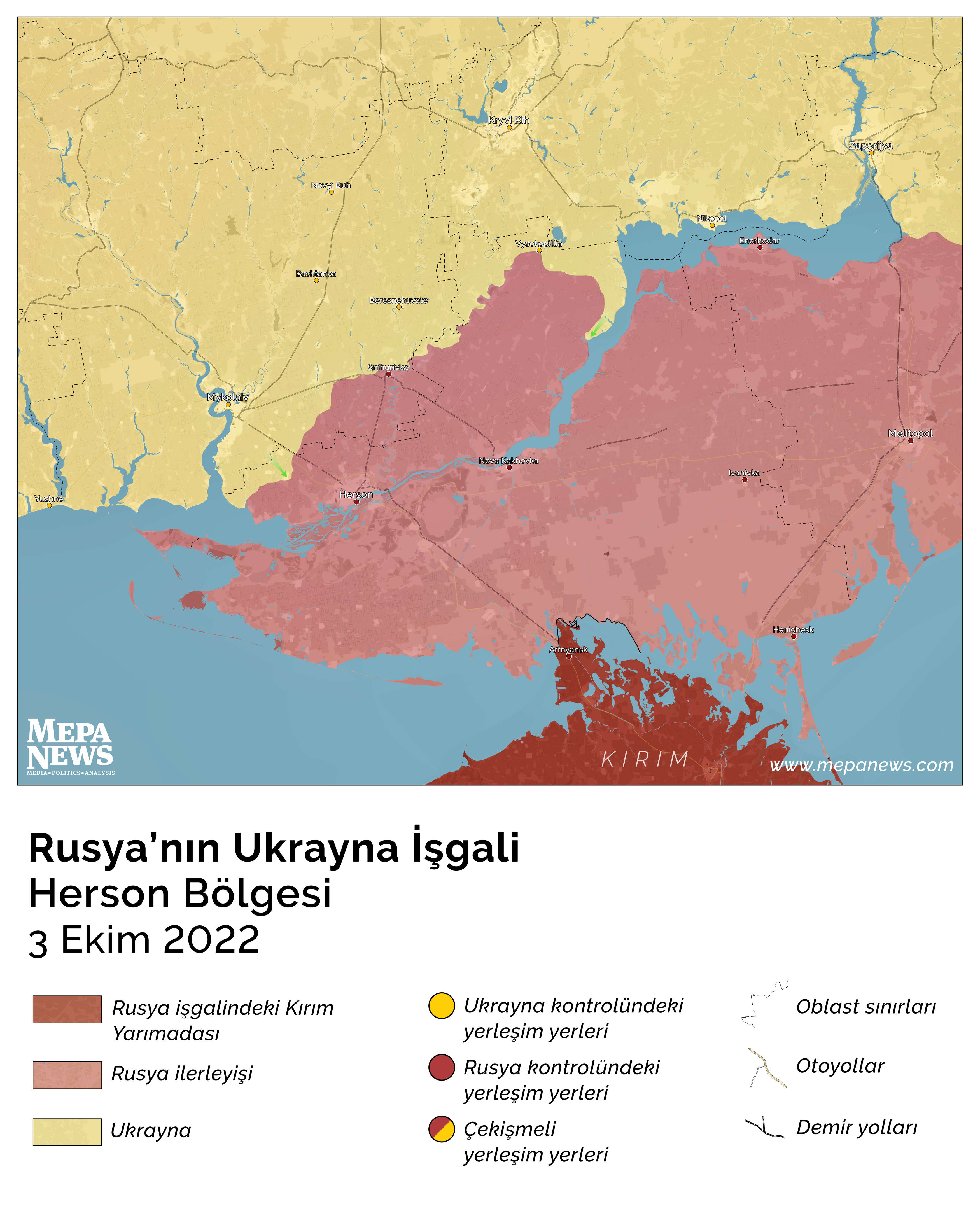 3 Ekim itibarıyla Rusya'nın Ukrayna'ya yönelik işgal harekatında Herson bölgesinde son durum ve yaklaşık kontrol alanlarına dair harita.