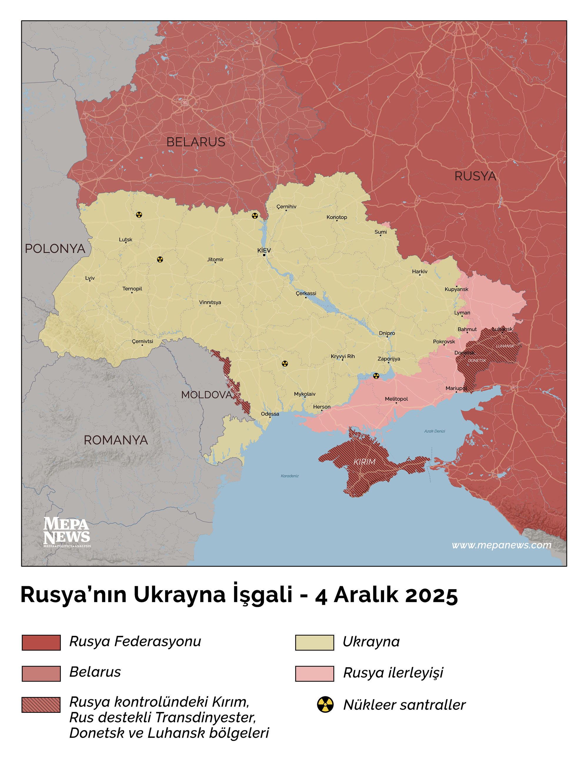 4 Aralık 2025 itibarıyla Ukrayna'da tarafların yaklaşık kontrol durumu şu şekilde: