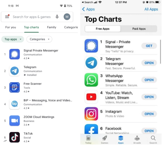 Türkiye'de ise durum biraz daha farklı uygulama marketlerine baktığımızda listenin ilk sırasını Telegram ve BiP uygulamasının paylaştığını görüyoruz.