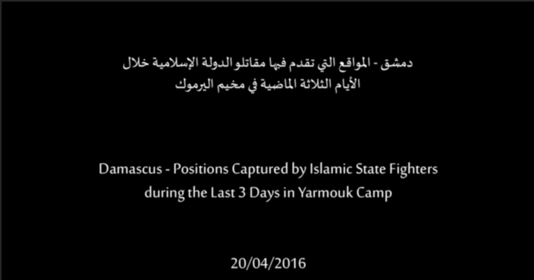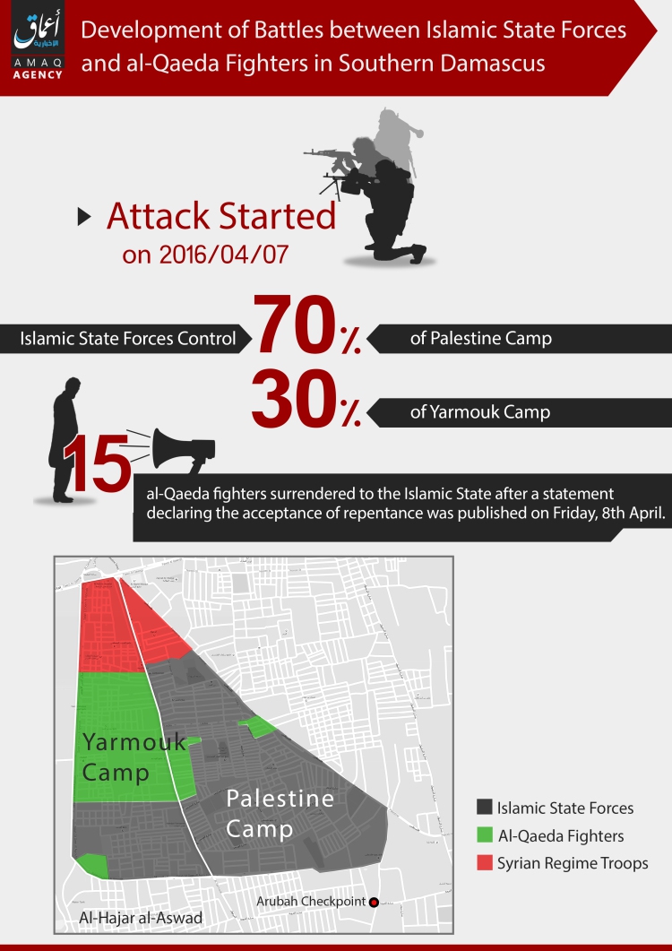 IŞİD’in üretken meyda aracının bir parçası olan Amaq Haber Ajansı, tam 14 Nisan tarihinde görünen bir infografik yayınladı. İnfografiğe göre IŞİD, Yermük Kampı’nın %30’unu ve yakınındaki ‘Filistin Kampı’nın %70’ini kontrol ediyor.. İnfografik aynı zamanda, Bağdadi’nin adamlarının el Kaide’nin kollarından ayrılan herhangi bir savaşçının affedileceği duyurusundan sonra 15 Nusra Cephesi savaşçısının teslim olduğunu belirtiyor.