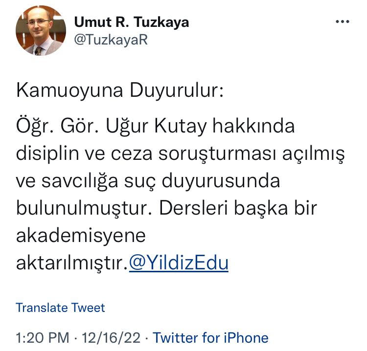 "Öğr. Gör. Uğur Kutay hakkında disiplin ve ceza soruşturması açılmış ve savcılığa suç duyurusunda bulunulmuştur. Dersleri başka bir akademisyene aktarılmıştır."